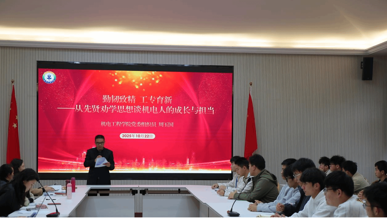 学院党委组织员周玉国以“勤韧致精,工专育新——从先贤劝学思想谈机电人的成长与担当”为题作交流发言。他引经据典,结合先贤智慧与学院专业特色,深刻阐释了勤奋、坚韧、专注、创新的精神内涵,勉励全体机电学子筑牢专业根基,勇担时代使命。